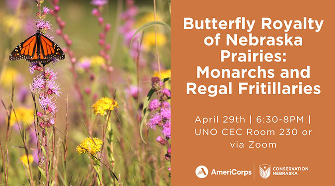 Apr 29 Butterfly Royalty of Nebraska Prairies: Monarchs and Regal Fritillaries 6:30 pm - 8:00 pm UNO's Barbara Weitz Community Engagement Center 6400 South, University Drive North, Omaha Event Details Get Directions